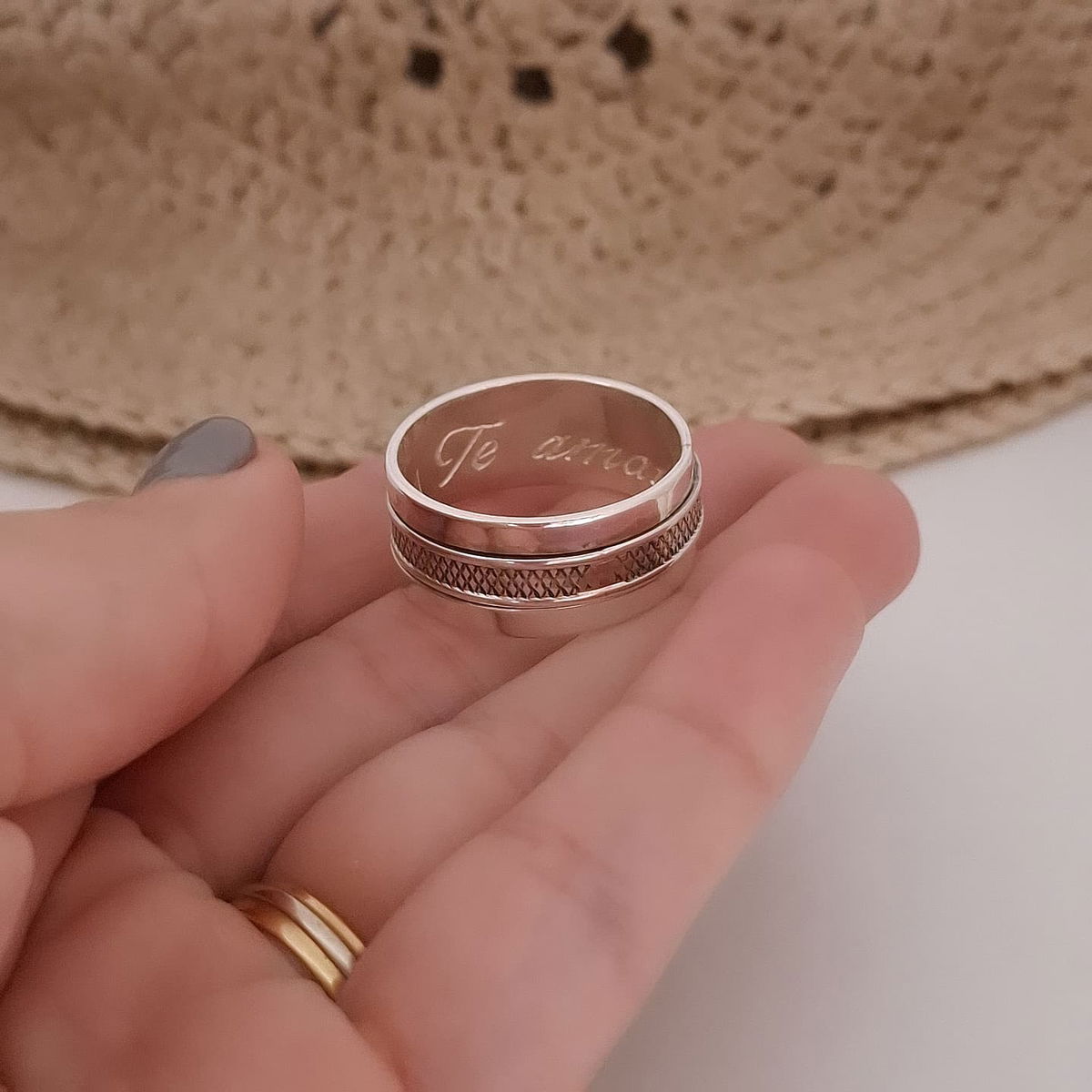 Este anillo antiestrés, elaborado a mano en Plata 925, fusiona elegancia con funcionalidad.